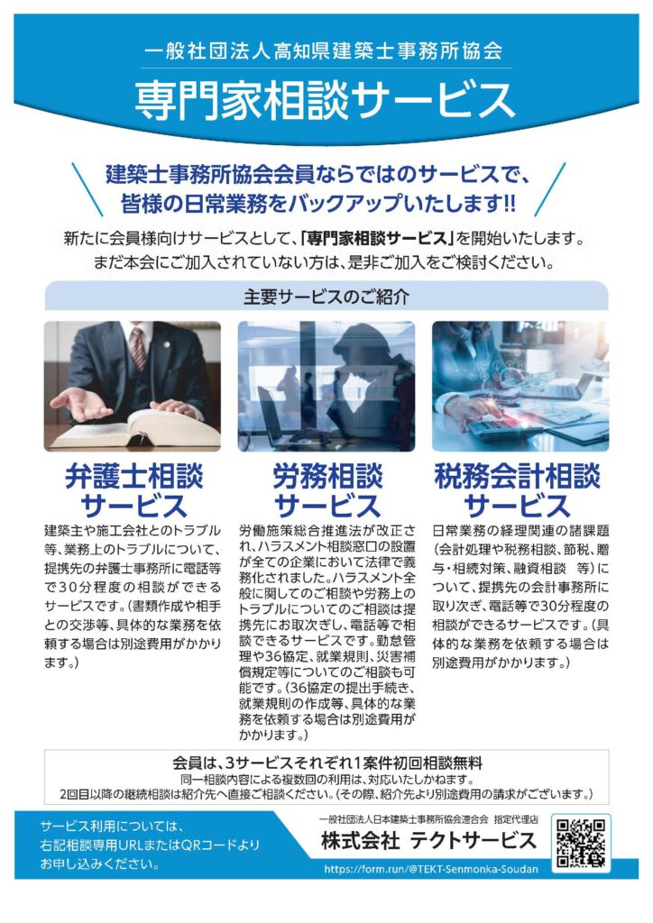 令和8年4月1日より高知県建築士事務所協会では新たに会員向けサービスとして弁護士、労務、財務会計の無料相談サービスを開始いたします。
